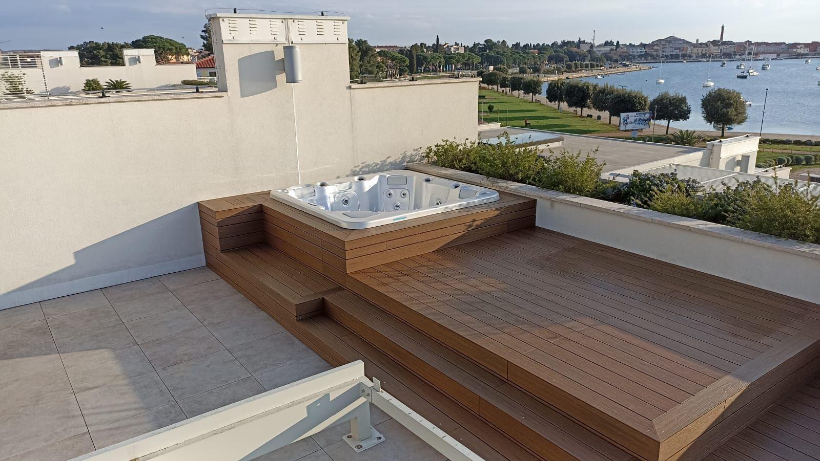 Nakon preciznog pozicioniranja, kada je ugrađena po mjeri te elegantno utopljena u decking oblogu. U sklopu projekta konstruirane su i funkcionalne stepenice od deckinga, čime je postignuta skladna cjelina i vrhunska estetika prostora.
